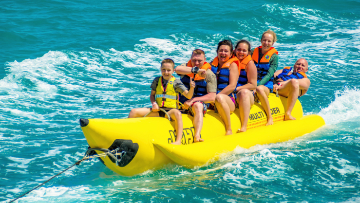 Sube con amigos o familia al banana boat y prepárate para reír a carcajadas mientras intentáis mantener el equilibrio ¡Una actividad llena de risas y acción!